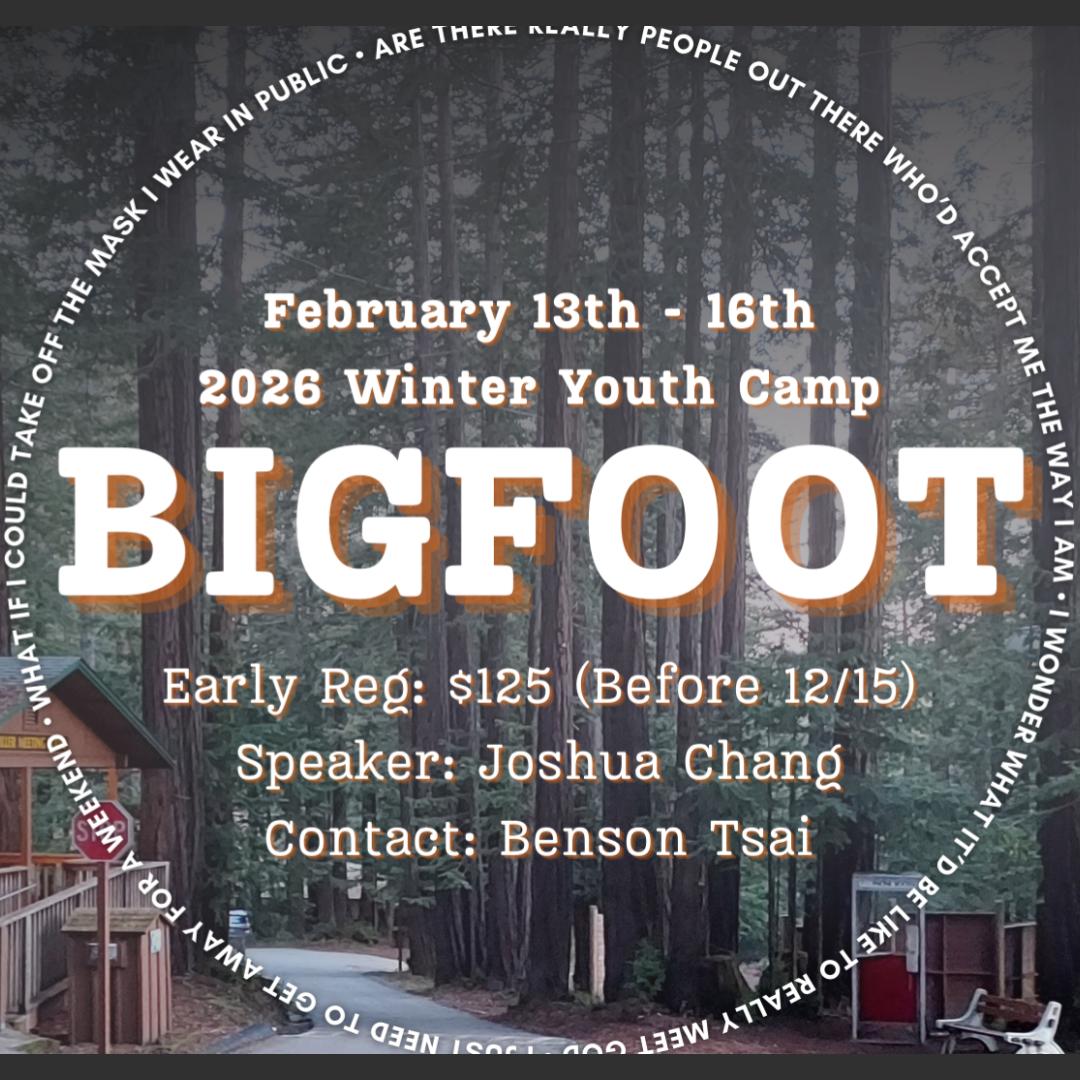 誠摯邀請所有 6 至 12 年級的學生參加我們一年一度的 Bigfoot 青少年退修會!在這四天三夜的週末營會中,我們將透過敬拜、信息與團體活動,幫助學生們親近神,並與屬靈夥伴建立更緊密的連結。